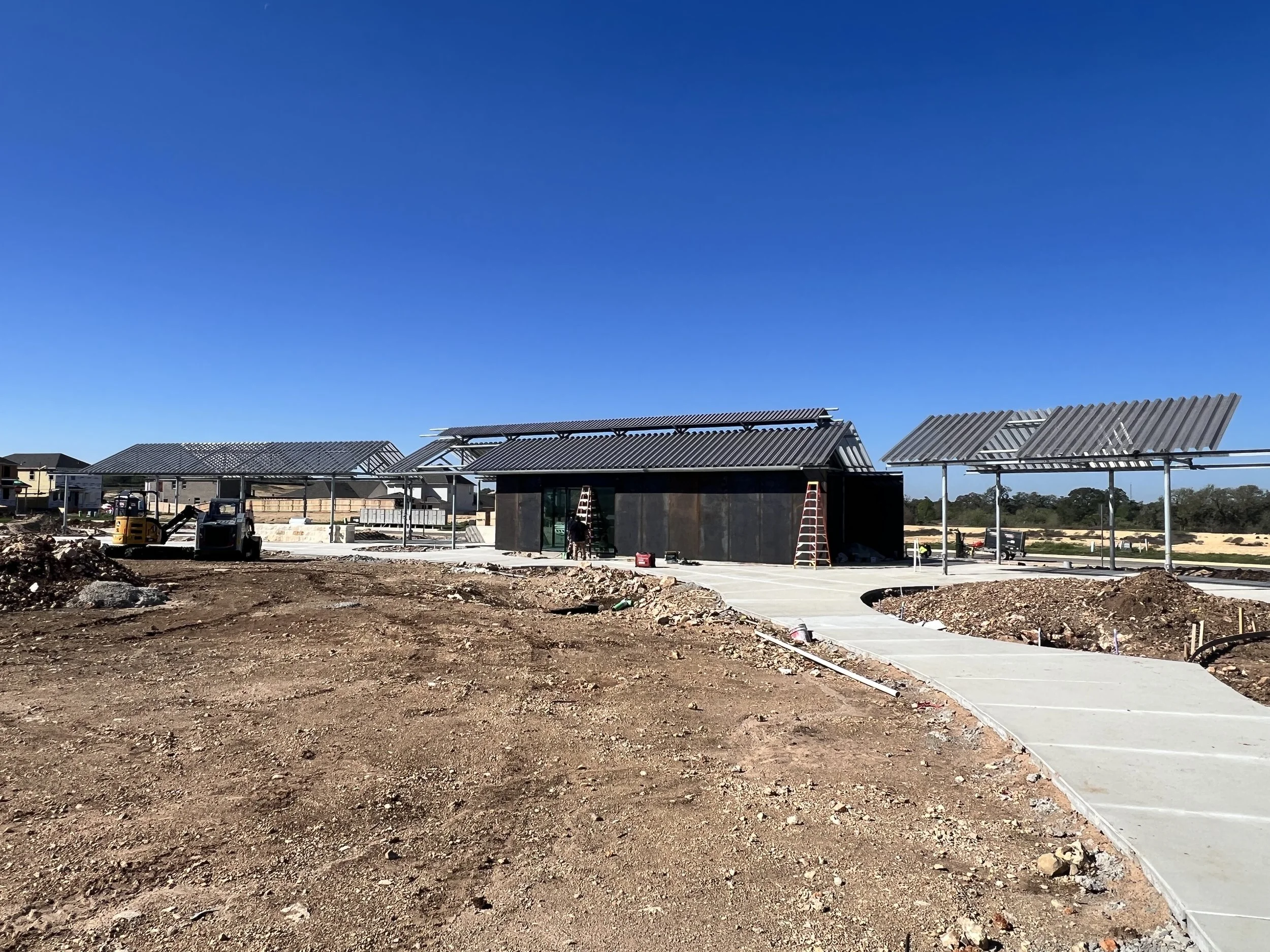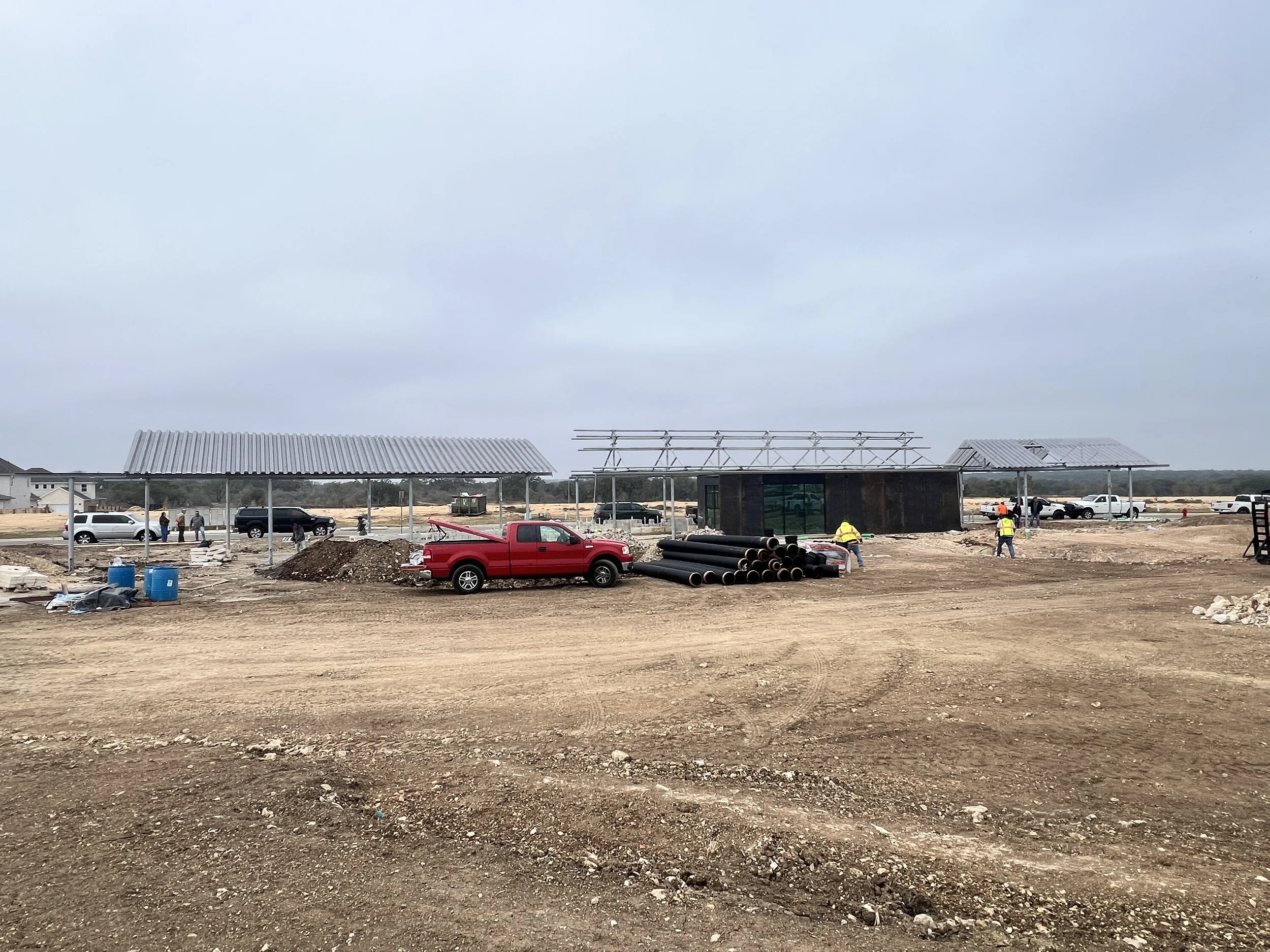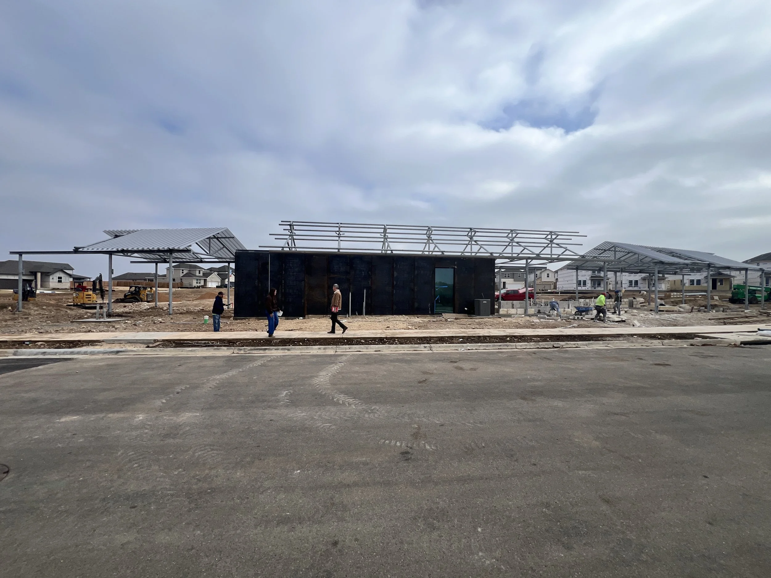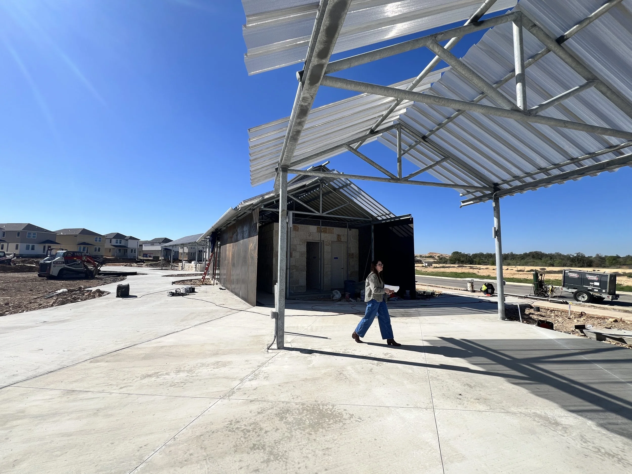 The Anthem Clubhouse was designed as a contemporary reimagining of the Texas Pipe barn for a new Central Texas community clubhouse. A large pipe truss canopy wraps the edge of a new community park which is being designed by our friends at TBG Landscape Architecture. Perforated corrugated roof panels provide shade for grilling and enjoying a drink while watching children play on the central lawn. A small steel structure tucked below the canopy holds restrooms, and a small "party barn" for community gatherings, and for cooling down in the hot Texas summers. The canopy is broken into 3 small segments which were designed to relate to small additional shade structures which will be built throughout this new community.