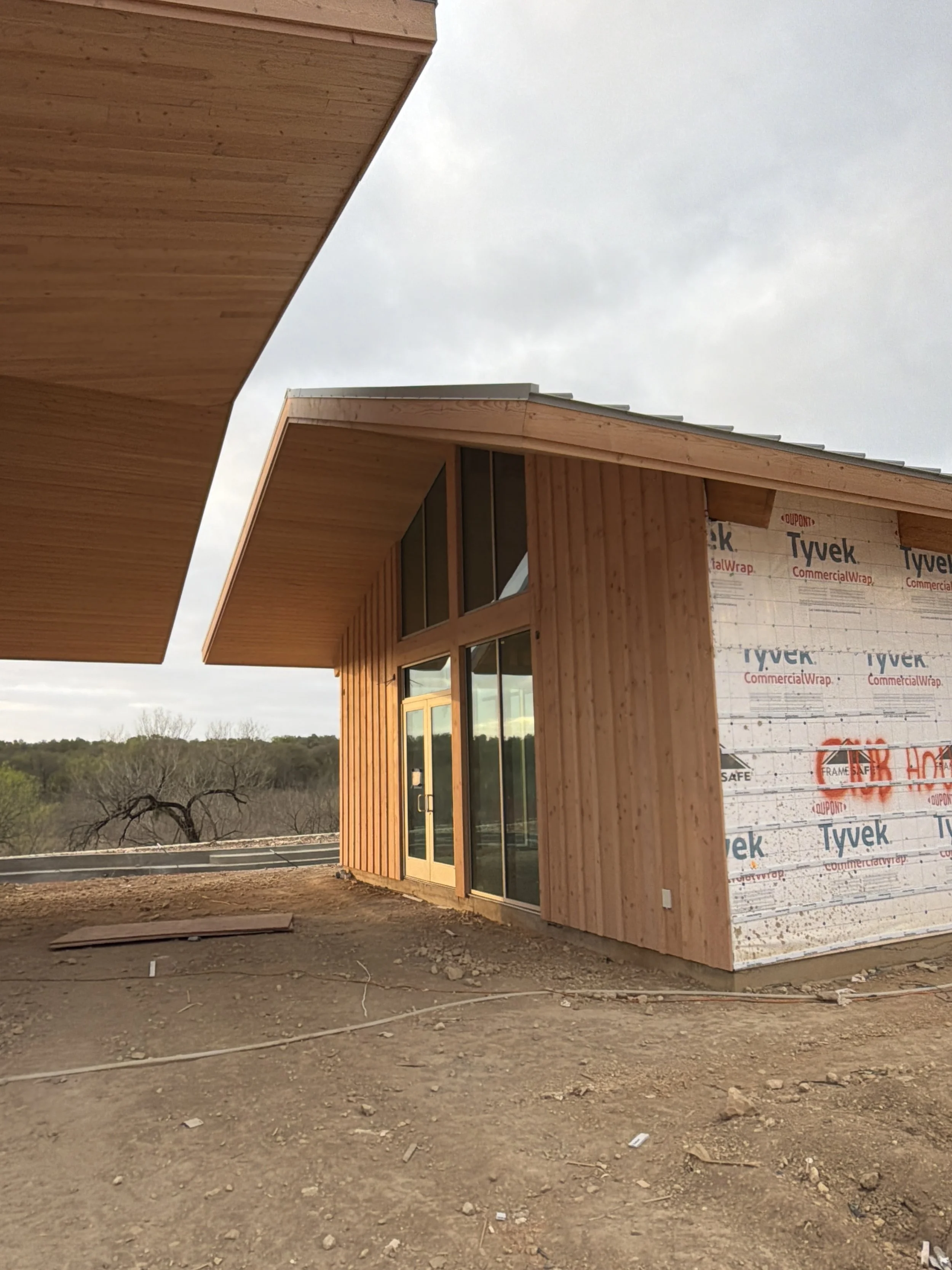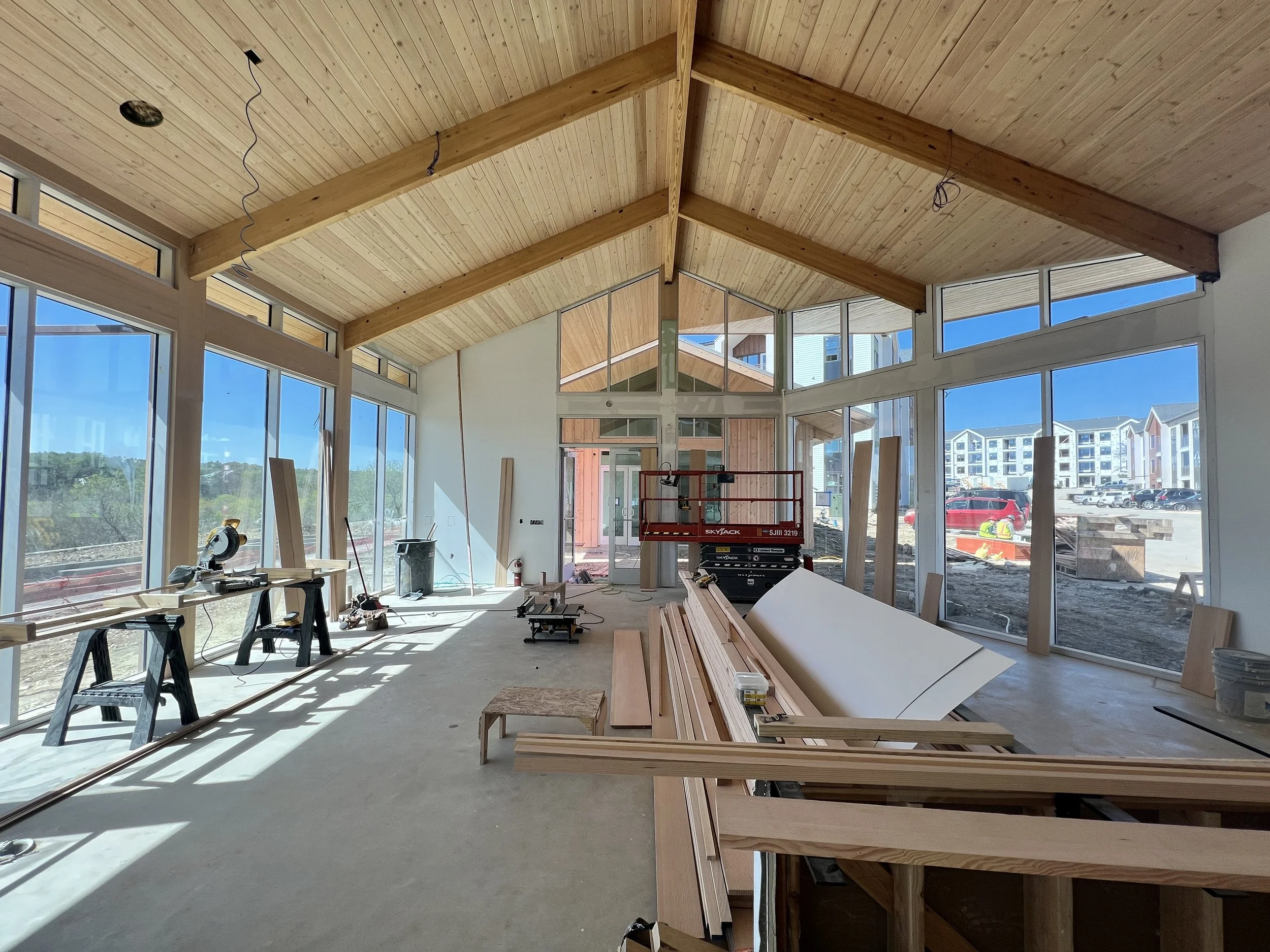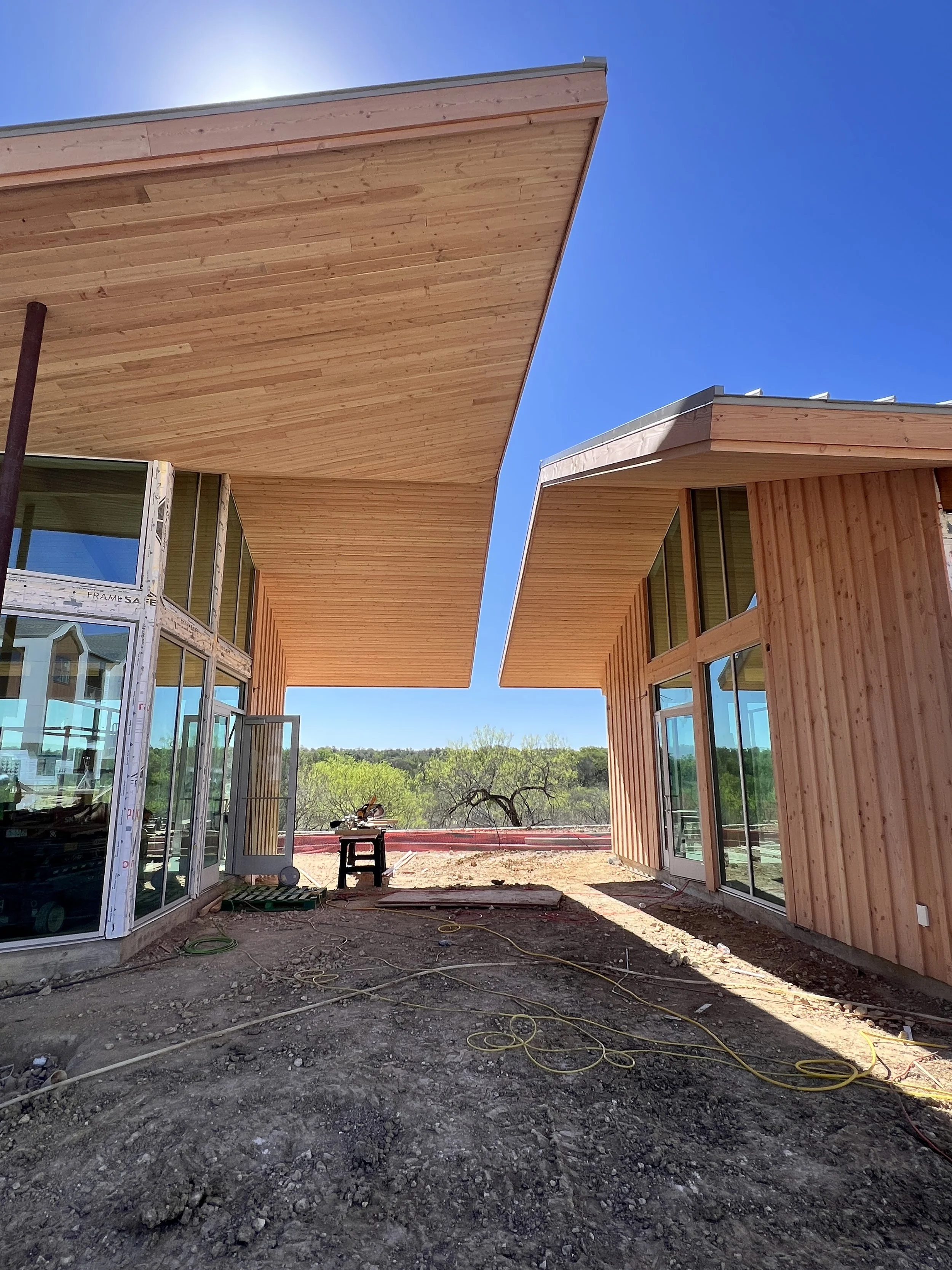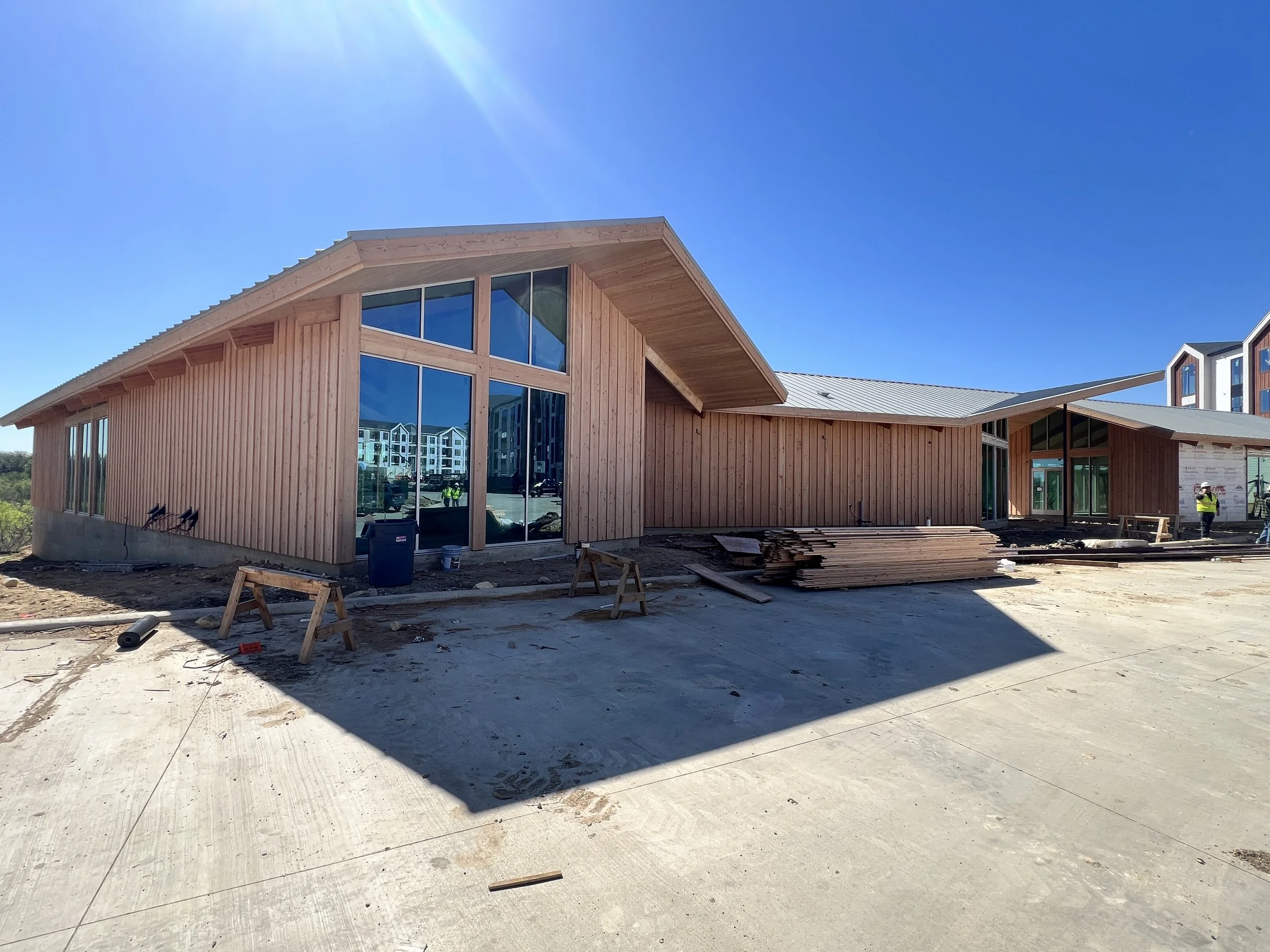 With a nod to the surrounding agricultural context, the Big Valley clubhouse celebrates the local Texas vernacular while at the same time incorporating numerous modern takes on the typology as well. Two linear forms collide at a diagonal, planting itself on the site in a more organic, non-aligned manner and allowing for several powerful formal opportunities in these collision points. An otherwise-typical gable roof breaks at a few strategic points, sometimes folding upward to indicate an entry point, sometimes breaking all together to highlight architectural elements below. The entire building is perched up slightly to give itself a slight break from the rest of the complex and focus its attention outward to the valley beyond.