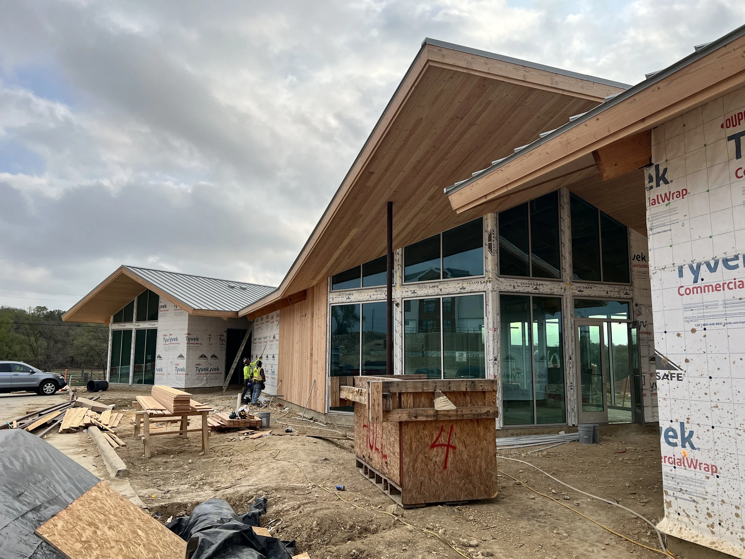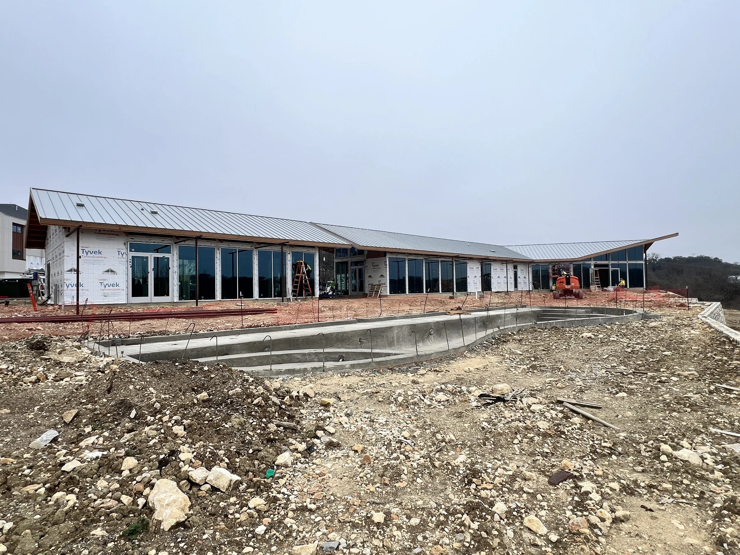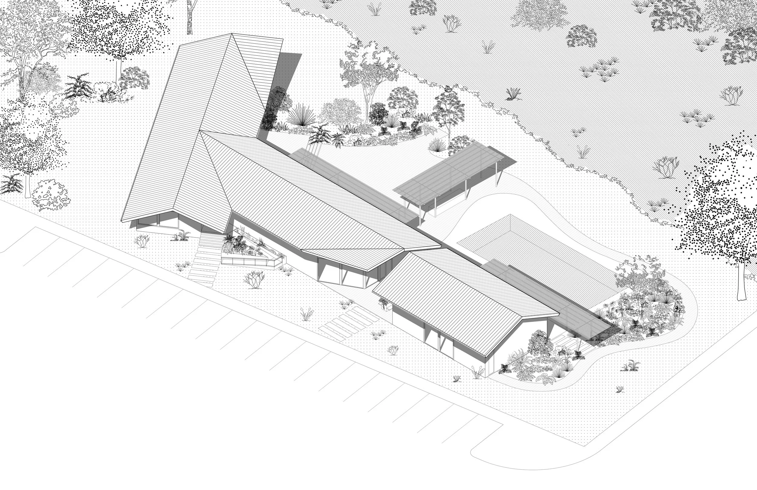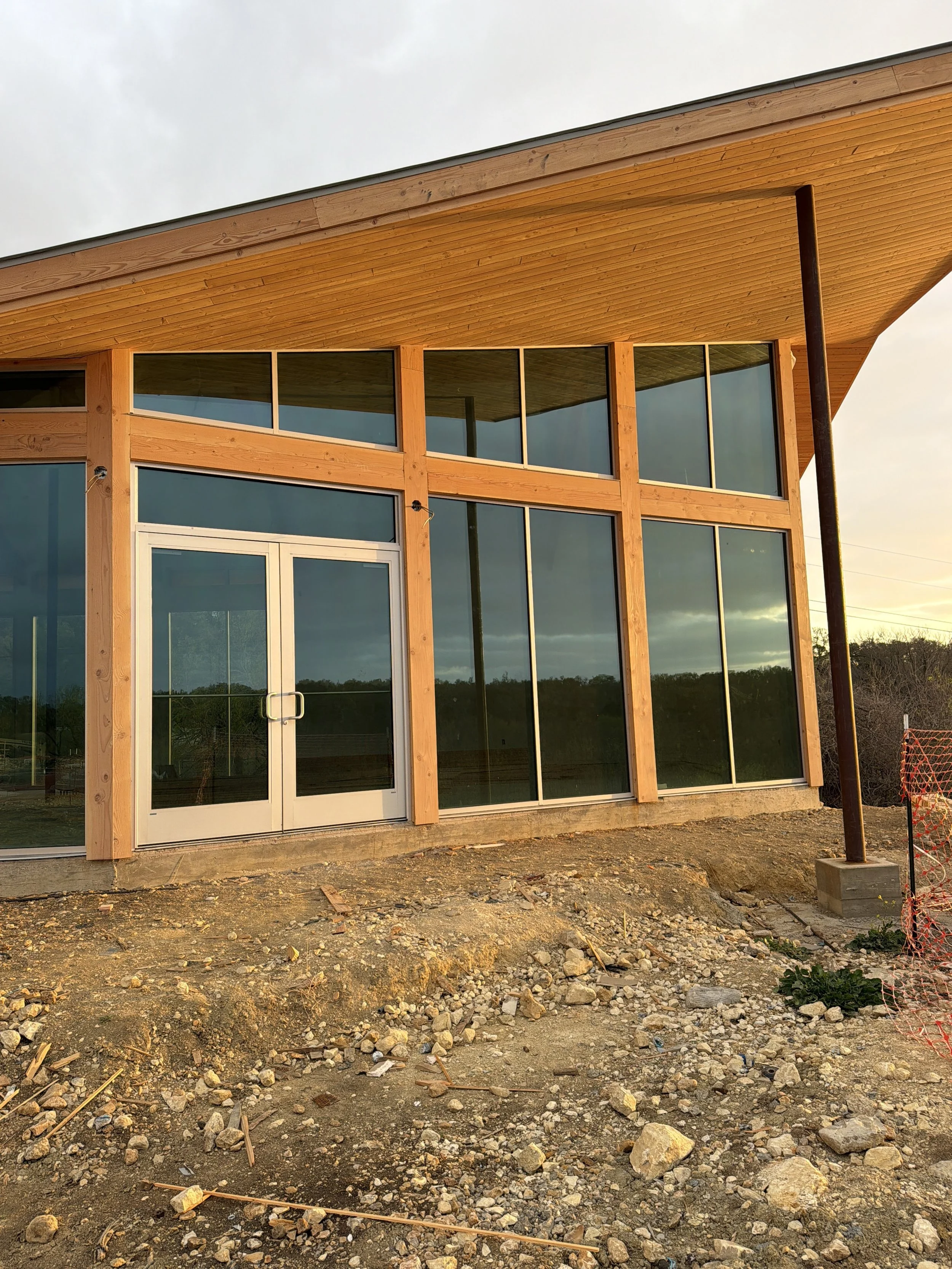 With a nod to the surrounding agricultural context, the Big Valley clubhouse celebrates the local Texas vernacular while at the same time incorporating numerous modern takes on the typology as well. Two linear forms collide at a diagonal, planting itself on the site in a more organic, non-aligned manner and allowing for several powerful formal opportunities in these collision points. An otherwise-typical gable roof breaks at a few strategic points, sometimes folding upward to indicate an entry point, sometimes breaking all together to highlight architectural elements below. The entire building is perched up slightly to give itself a slight break from the rest of the complex and focus its attention outward to the valley beyond.