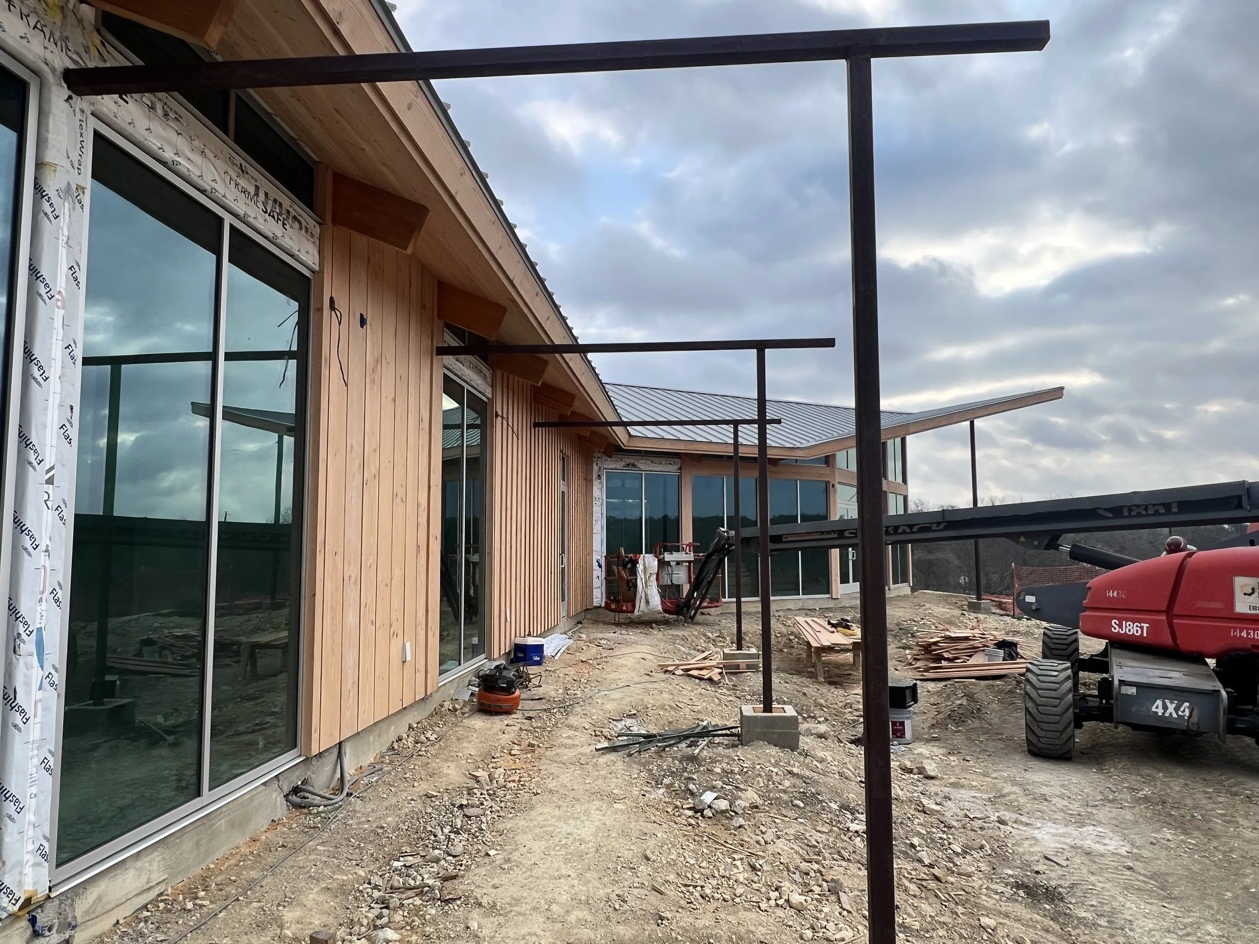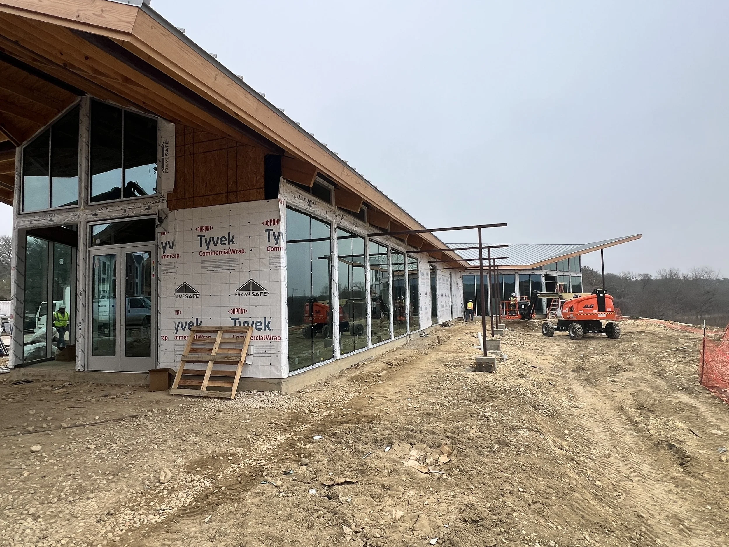 The site, perched adjacent to an untouchable flood plain valley, takes advantage of the rolling hills and raw landscape that serves as the backdrop to a long, slender building that hugs the edge of the valley. Thus, it felt appropriate to approach the exterior gathering moments as opportunities to highlight the topography around it. A long, covered porch wraps the entire rear length of the building, with unobstructed views enjoyable from all points within- and immediately outside of the clubhouse. A secondary open-trellis roof structure attaches to the building above the porch, providing some relief to those basking in the outdoors. And, to immerse guests one level further, a boardwalk element at the end of the patio is flanked by a lush and dense landscape to emphasize the importance of the scenic qualities of the Big Valley site.